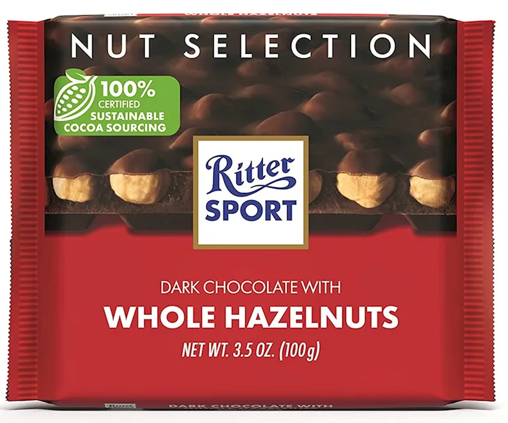 "RITTER SPORT" DARK CHOC. W/WHOLE HAZELNUT 100GR $2.85/10PC