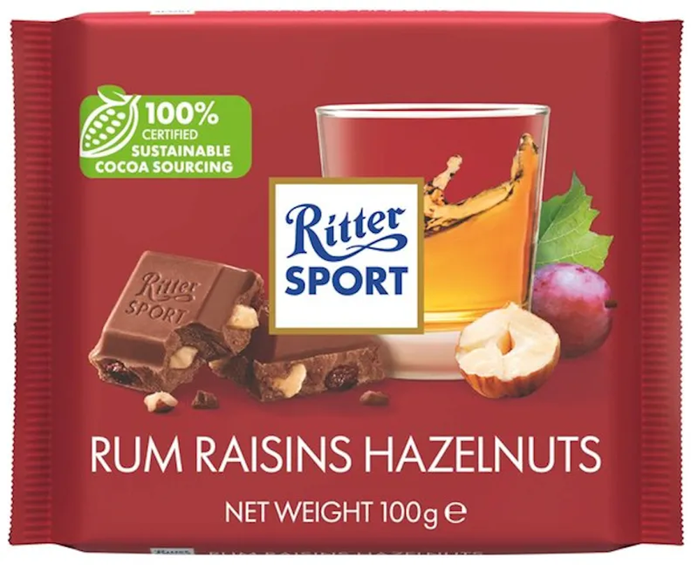 "RITTER SPORT" MILK CHOC. W/RUM, RAISIN, NUTS 100GR $2.85/12PC