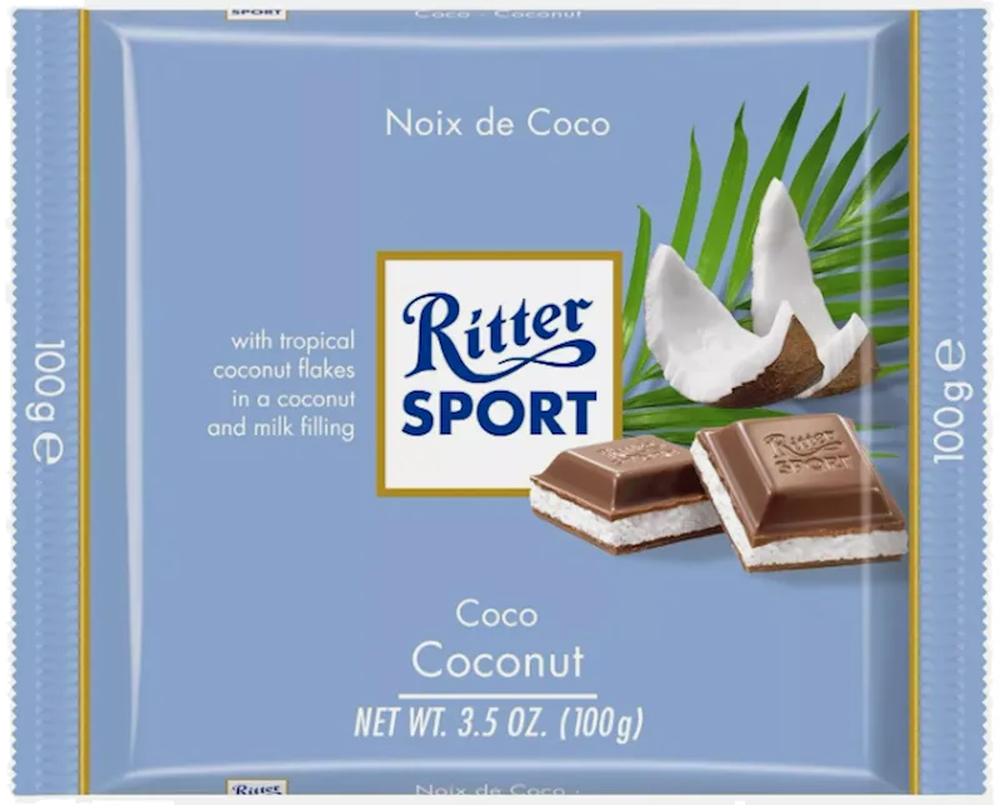 "RITTER SPORT" MILK CHOC. COCONUT 100GR $2.85/12PC