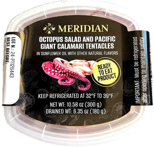 "MERIDIAN" OCTOPUS SALAT W/GIANT SQUID TENTAKLES IN OIL 300GR $8.65/12PC N/D