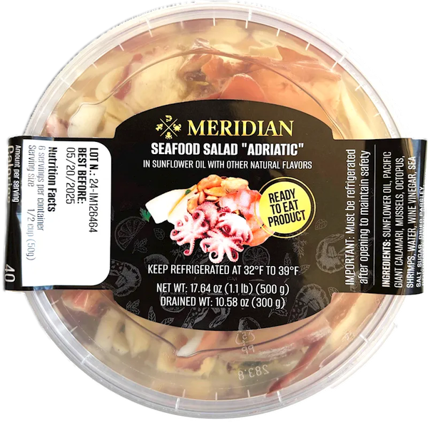 "MERIDIAN" SEAFOOD MIX ADRIATIC IN OIL 500GR $10.25/8PC N/D