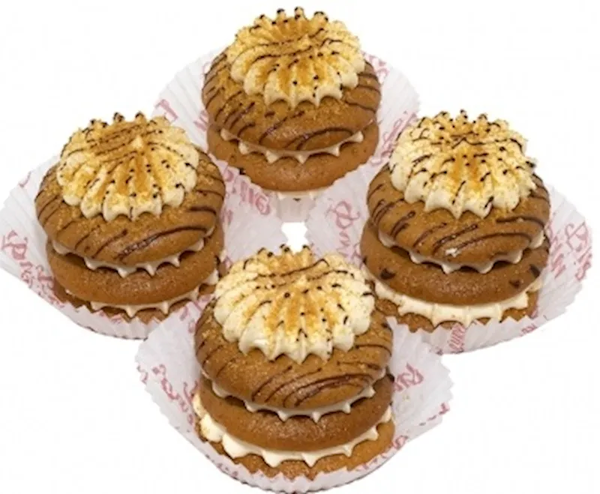 Пирожное из нежного медового бисквита с ванильным кремом на основе нежных сливок и сгущённого молока, посыпано медовой крошкой и оформлено шоколадной глазурью.