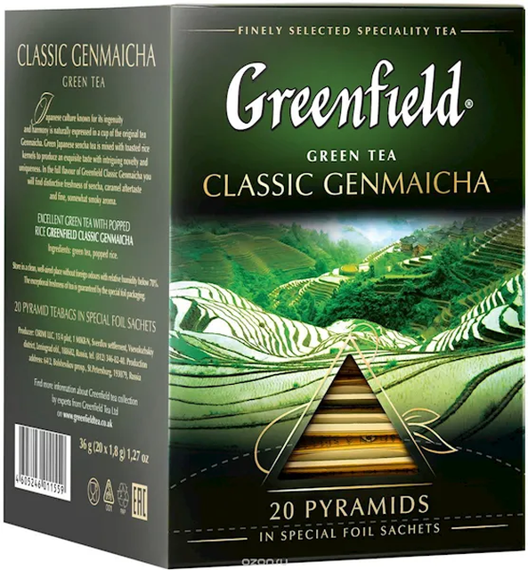 "GREENFIELD" BL. TEA "CLASSIC GENMANCHA" 20 PYRAMID TB. $2.45/8PC