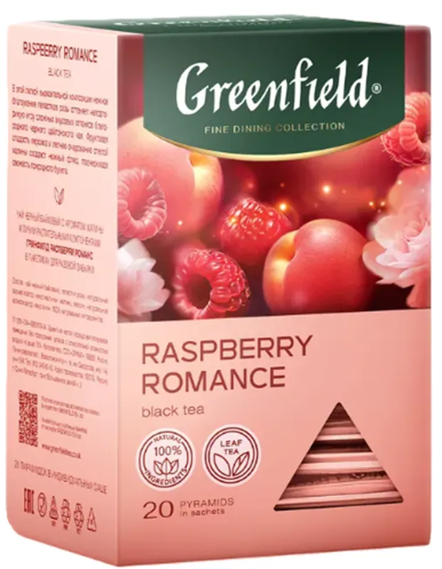 "GREENFIELD" BL.TEA "RASPBERRY ROMANCE" 20 PYRAMID TB. $2.45/8PC